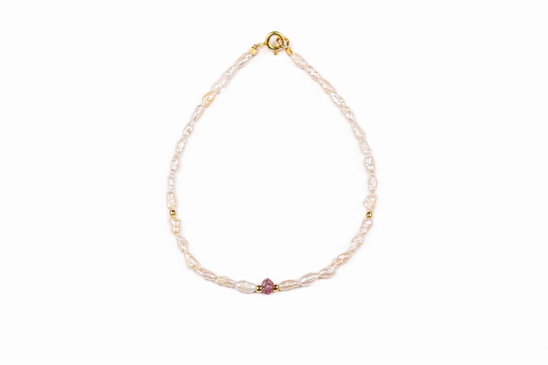 Náramek je vyroben z nepravidelných lesklých sladkovodních perel vysoké kvality, zlaceného stříbra Ag925/1000 a jednoho přírodního surového diamantu v růžové barvě.