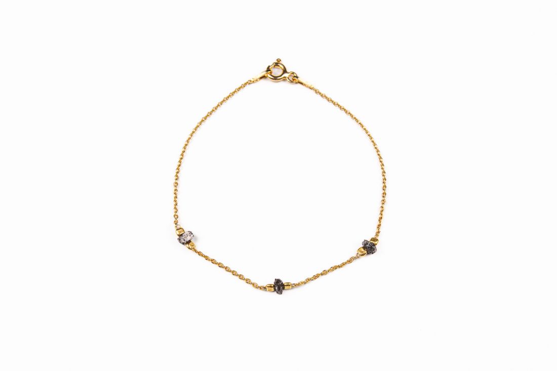 Náramek se třemi většími černými diamanty na zlaceném stříbrném řetízku.