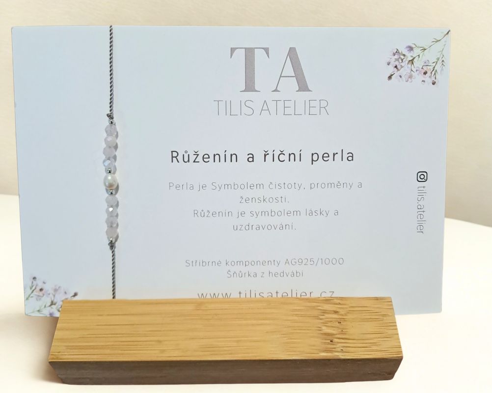 Náramek s přírodním nedobarvovaným růženínem a se sladkovodní perlou na šňůrce z pravého hedvábí.