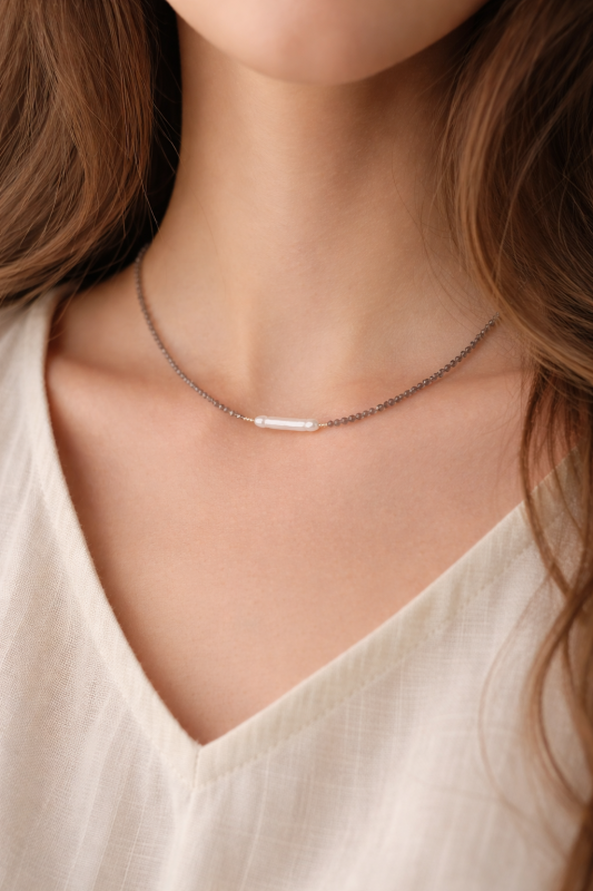 Dominantou šperku je podélná sladkovodní perla, která dodává náhrdelníku jedinečný charakter a jemný luxusní akcent.