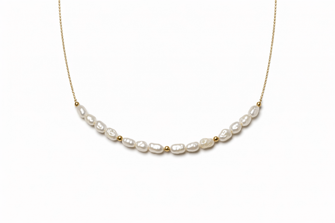 Tento výjimečný šperk kombinuje krásné nepravidelné perly s jemnými zlatými detaily, což minimalistický a moderní designu.