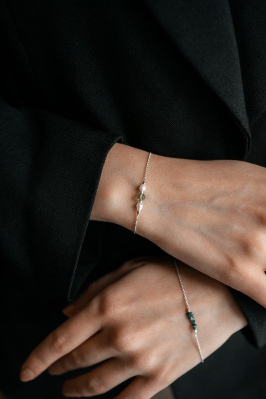 Náramek s přírodním průzračným olivínem v krásně syté barvě v drahokamové kvalitě s přírodními říčními perlami.