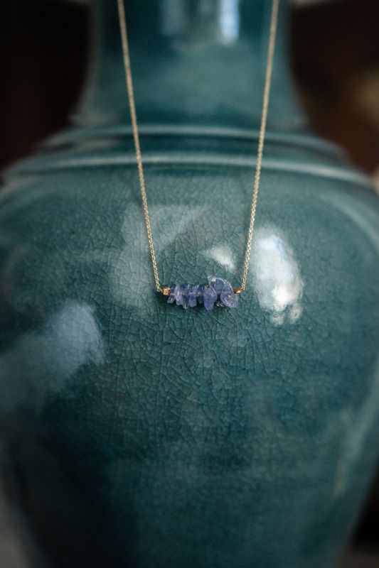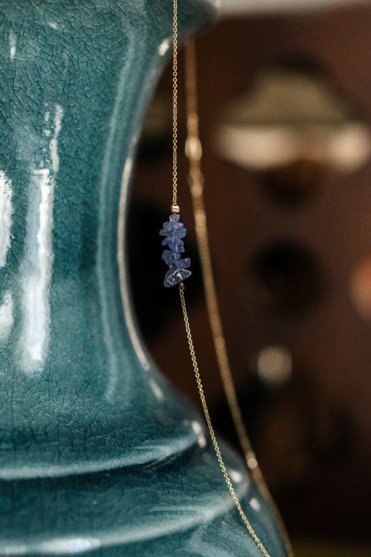 Několik nepravidelných přírodních tanzanitů zachycených na jemném řetízku ze stříbra Ag925/1000.