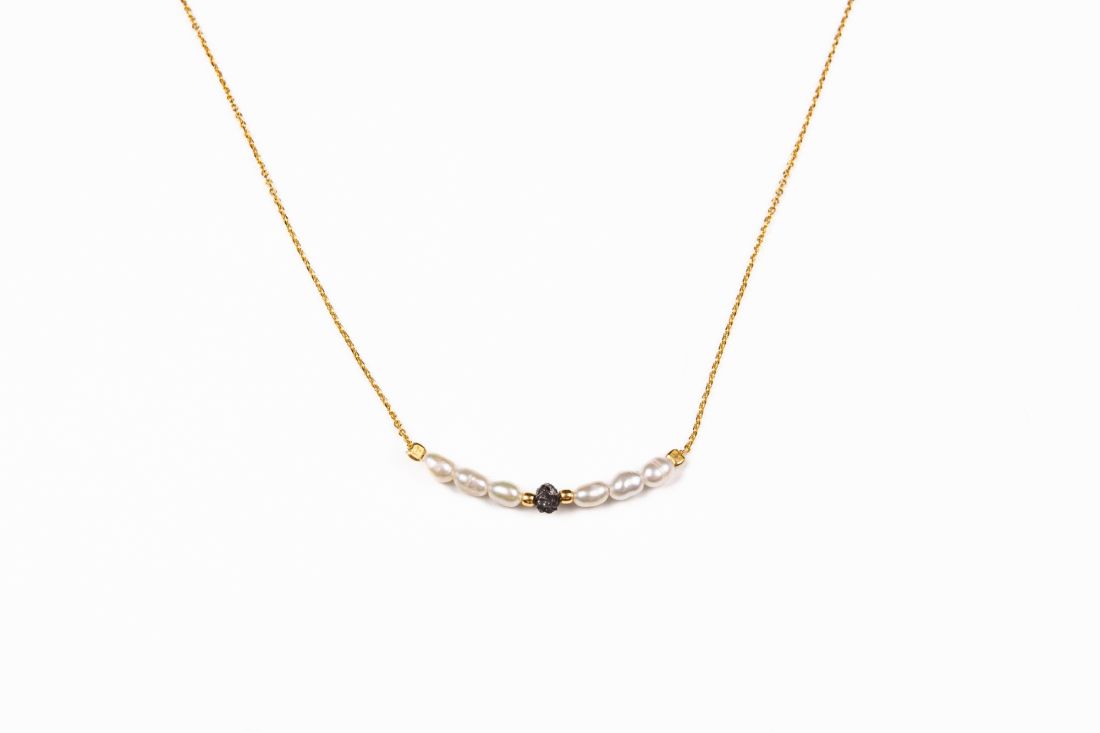 Uprostřed jemného zlaceného řetízku září surový černý diamant – v přirozeně pravidelném tvaru, který podtrhuje jeho syrovou krásu. Obklopují ho sladkovodní perly, symbol čistoty a klidu.