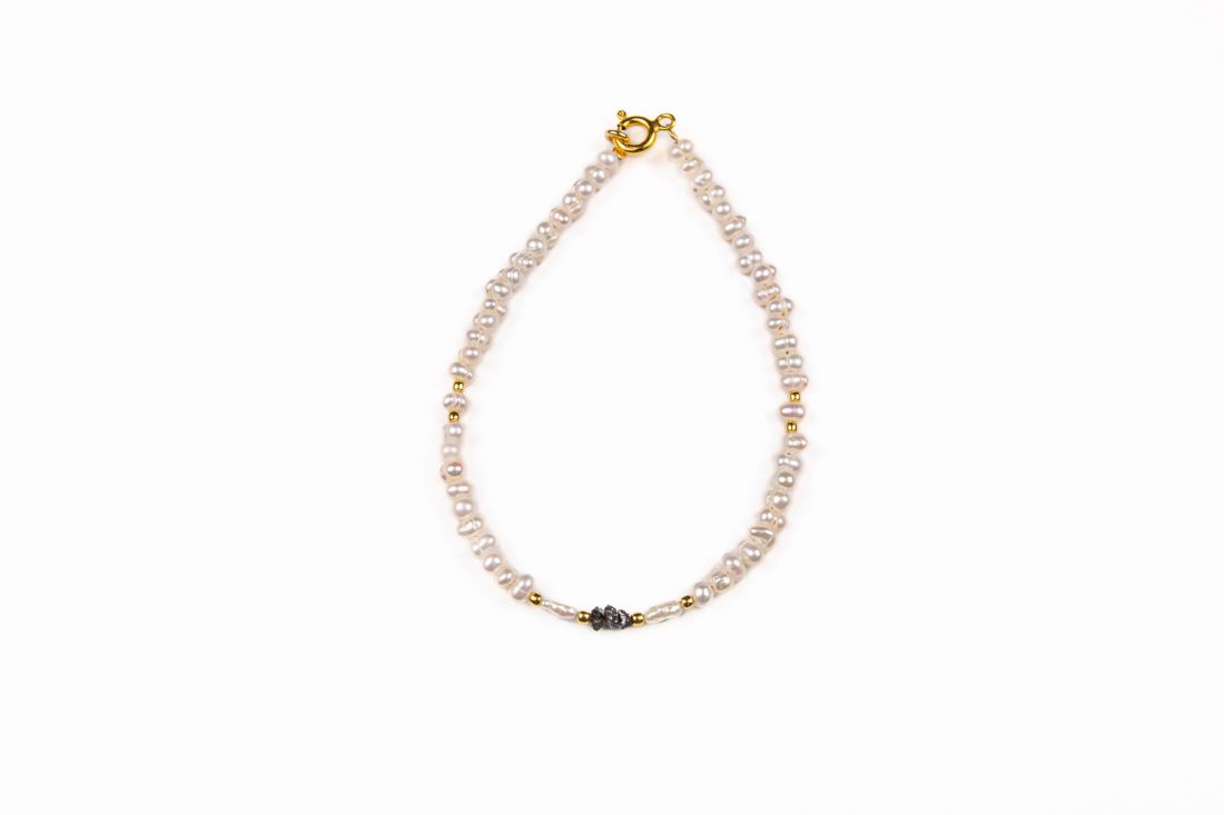 Uprostřed náhrdelníku i náramku se třpytí tři drobné černé diamanty, které symbolizují sílu, rovnováhu a nadčasovou eleganci. Jejich lesk nádherně kontrastuje s jemným hedvábným leskem sladkovodních perel, které šperk obklopují.
