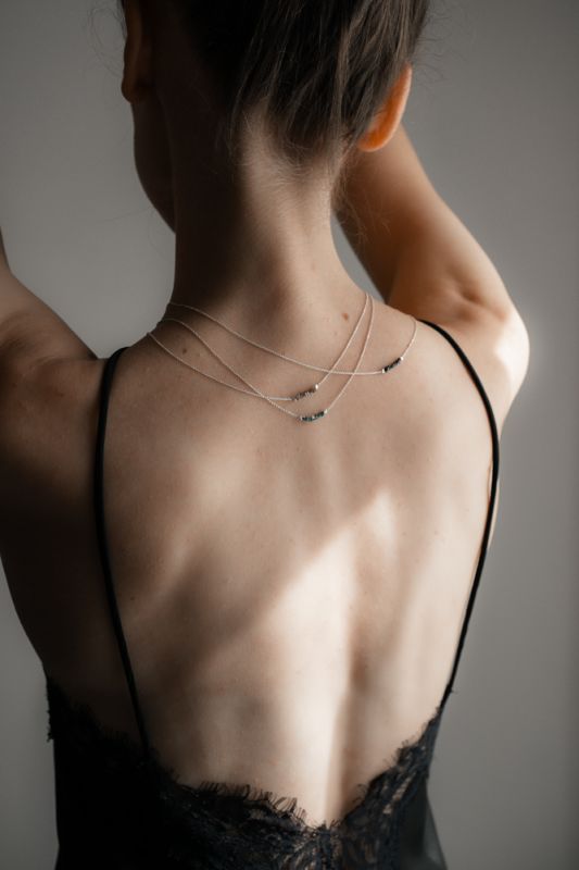Náhrdelník No.9 Noir Collar má devět surových černých diamantů zachycených na jemném stříbrném řetízku.