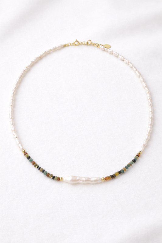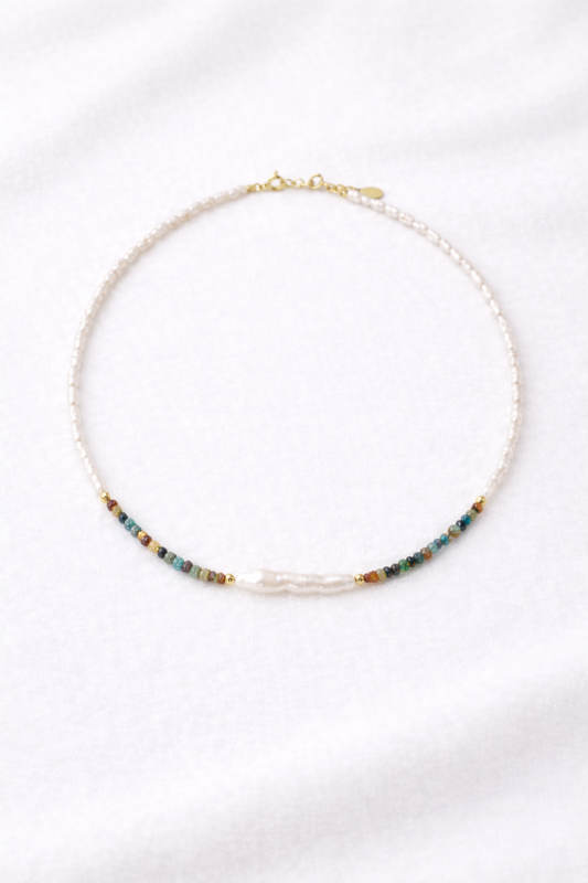 Náhrdelník The Journey je oslavou přirozené krásy a radosti z barev. V jeho středu se nachází jedna podlouhlá sladkovodní perla nepravidelného tvaru, o délce přibližně 3 cm a šířce 1,5 cm. Každý kus perly je originál.