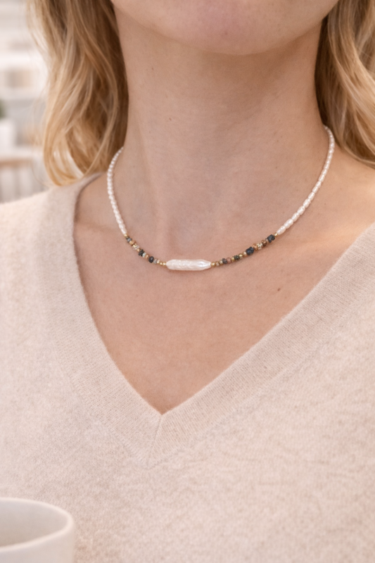 Náhrdelník je ideální volbou pro ty, kteří milují originální šperky, kombinaci elegance a hravosti a krásu přírodních materiálů.