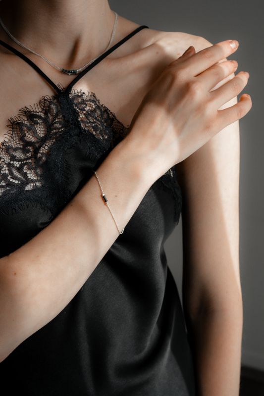 Náramek No.3 Sol má tři surové černé diamanty zachycené na jemném stříbrném řetízku, který je zlacený dvěma vrstvami 18kt zlata a třetí vrstvou galvanizace, která chrání šperk před oxidací a změnou barvy, přičemž si šperk zachovává hypoalergenní vlastnosti.