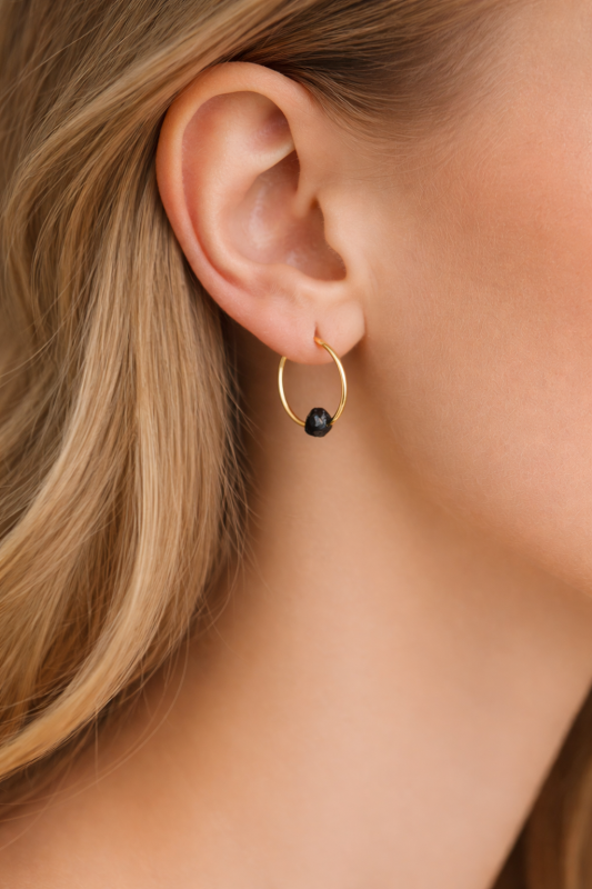Zlacené náušnice s černým přírodním surovým diamantem vypadjí jemně a zároveˇv v sobě nesou hloubku a tajemno černého diamantu.