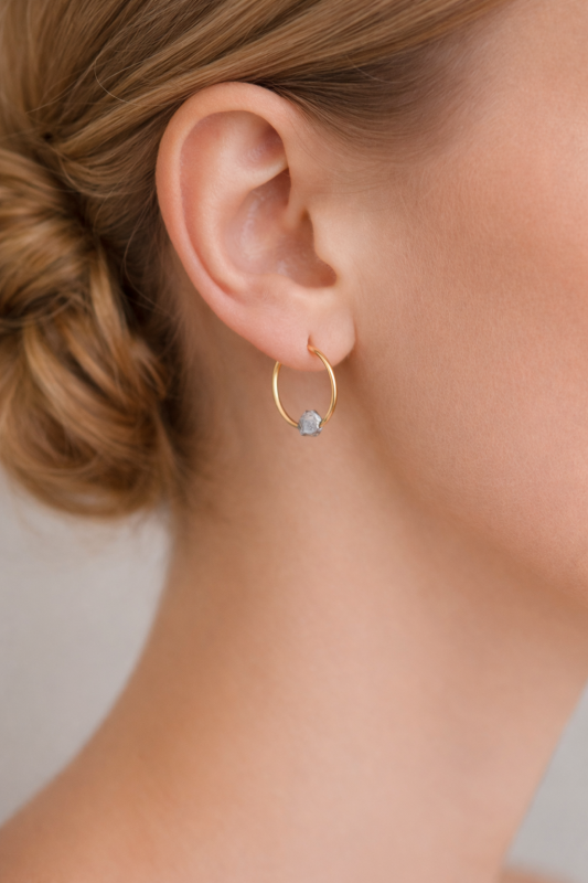 Zlacené náušnice se stříbrným přírodním surovým diamantem vypadjí jemně a zároveň působí minimalisticky.