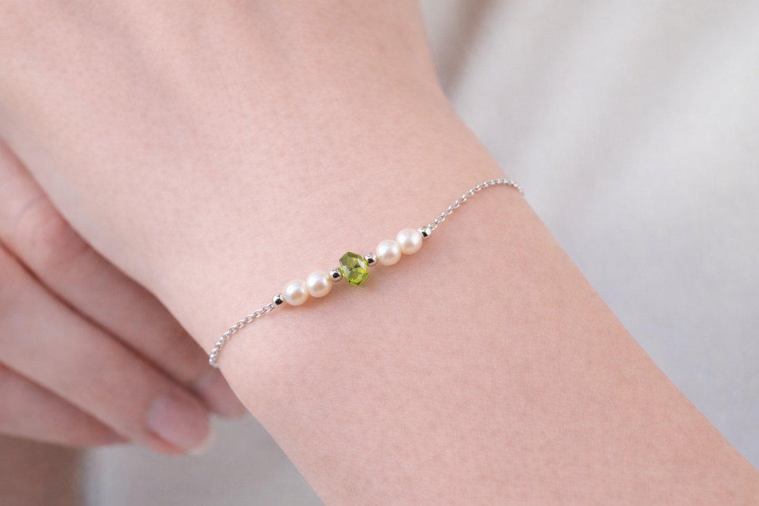 Náramek s přírodním průzračným olivínem v krásně syté barvě v drahokamové kvalitě s přírodními říčními perlami.