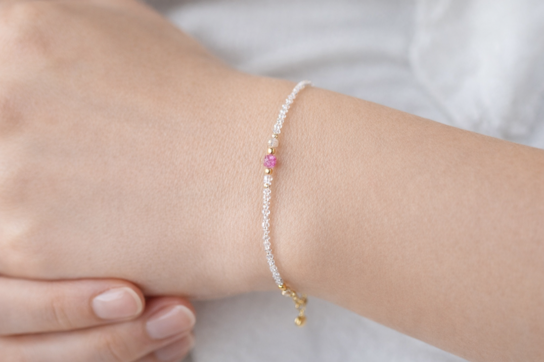 Minimalistický šperk, který v sobě nese sílu hor i jemnost detailu. Tento ručně vyráběný náramek je tvořen drobnými, nepravidelnými kamínky horského amerického diamantového křišťálu, známého svou výjimečnou čistotou a přirozeným leskem. Každý kamínek má velikost cca 2 mm, díky čemuž působí náramek lehce, nenápadně a velmi elegantně.