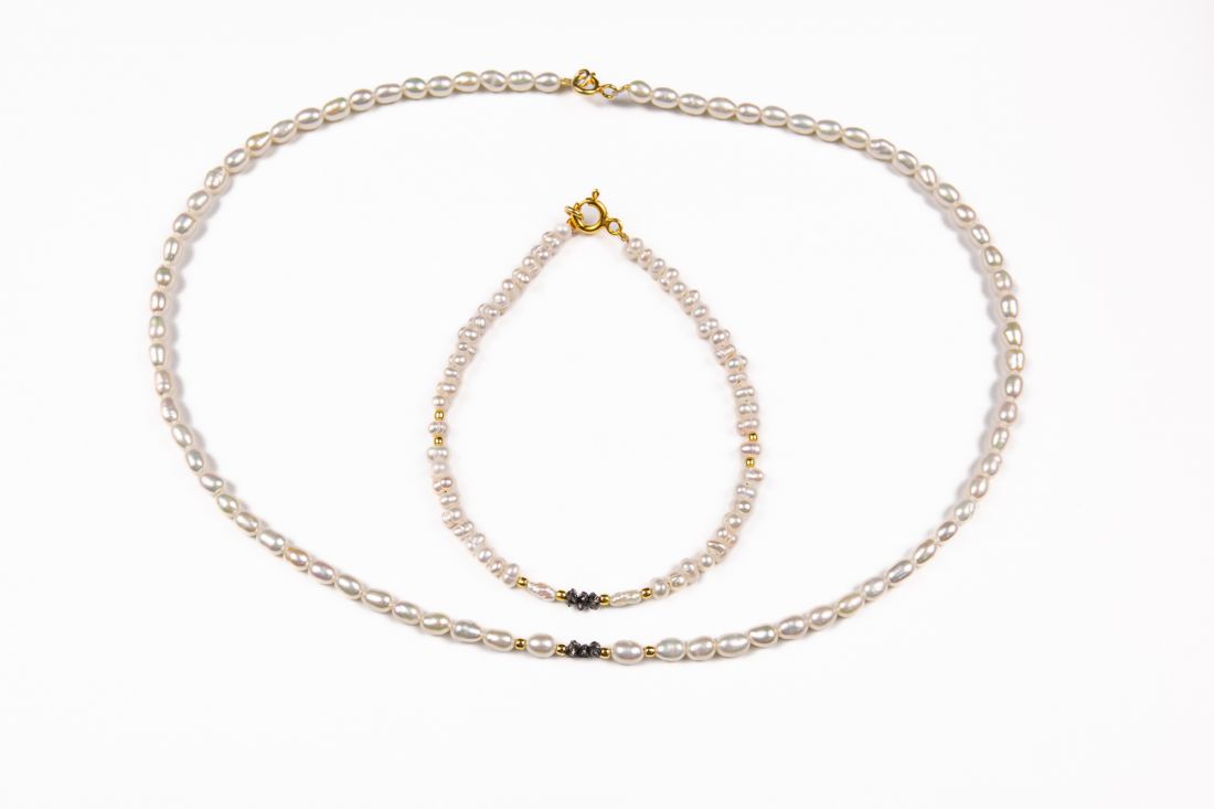 Ručně vyráběný set, který v sobě spojuje jemnost perel a tajemnou hloubku černých diamantů.