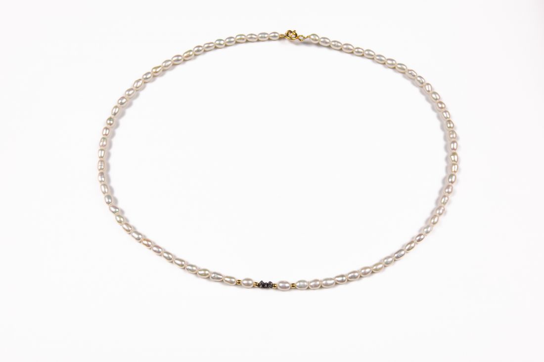 Uprostřed náhrdelníku i náramku se třpytí tři drobné černé diamanty, které symbolizují sílu, rovnováhu a nadčasovou eleganci. Jejich lesk nádherně kontrastuje s jemným hedvábným leskem sladkovodních perel, které šperk obklopují.